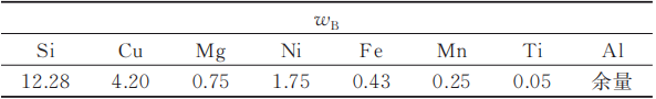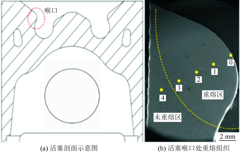 图1 活塞剖面示意图和活塞喉口处重熔组织 表1 试验合金的化学成分(%)