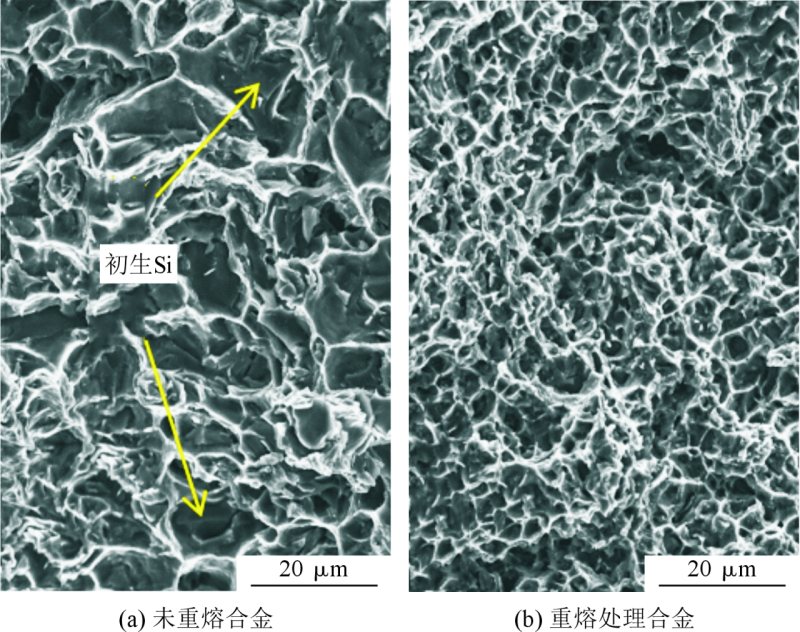 图8 合金重熔处理前后的断口形貌图 结论 (1)Al-Si活塞合金经激光重熔处理后,重熔区最大深度为3.5 mm,晶粒尺寸随着重熔深度的增加而有所增大。合金重熔深度为2 mm处的硬度(HV)最高,达140.63,较未重熔区的硬度提升了33.43%。350 ℃下的高温抗拉强度由未重熔处理的94.16 MPa提高至124.93 MPa,伸长率由未重熔处理的0.46%提高到1.37%。这主要是由于重熔处理显著细化了合金的微观组织,增加了合金基体的过饱和度和第二相颗粒的数量。 (2)重熔不同深度初生Si、共晶Si以及第二相的形态特征存在明显差异。随着重熔深度的增加,共晶Si和第二相的尺寸逐渐增大,且共晶Si的分布由弥散分布向枝晶臂间逐渐集中。初生Si的尺寸随着重熔深度的增加先减小后增大,在重熔深度为2 mm处最小,约为2 μm。 《激光重熔对活塞用Al-Si合金组织和力学性能的影响》 刘飞1,2 韩笑1 刘世英2 冯增建2 熊培友2 王君2 姜殿昌2 1. 内蒙古工业大学材料科学与工程学院;2. 滨州渤海活塞有限公司 本文转载自:《特种铸造及有色合金》 |