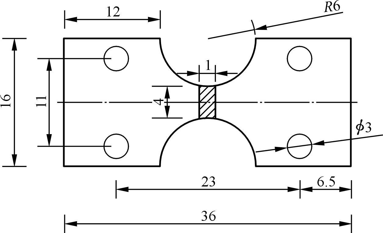 采用D/MAX-2500/PC型X射线衍射仪(XRD)对试验合金的物相组成进行分析。扫描速度为3 (°)/min,衍射角度范围(2θ)为20°~80°,X射线靶材为Cu靶,加速电压为40 kV。利用Quanta 650型扫描电镜(SEM)及其配套的Oxford X-max 50型能谱仪(EDS)对重熔深度为0、1、2、3、3.5(重熔区与未重熔区界面)和4 mm(未重熔区)处的合金微观组织和元素分布进行分析。使用80~2500号的砂纸将试验合金块进行粗磨,然后使用粒度为W1.0的金刚石研磨膏将试件表面精抛至无划痕,最后使用清水擦洗晾干后放在扫描电镜下观察。使用Oxford Nordlys Nano型电子背散射衍射仪(EBSD)分析合金的晶粒形状及大小。硬度测试采用HVS-30Z/LCD型维氏硬度计,载荷为1.96 N,保荷时间为15 s,压头是直径为ϕ5 mm、面角为136°的正四棱锥形,保压10 s。每个试样经打磨抛光后在测试面上打12个点,去掉最高值和最低值,取平均值。拉伸试验采用Instron 5569型万能电子拉伸试验机进行,拉伸速率为5×10-4 s-1,每组拉伸进行3次,取平均值。在活塞喉口处截取拉伸试样,对其表面进行抛光处理。拉伸试样几何尺寸见图2。拉伸结束后,使用扫描电镜对拉伸断口形貌进行观察。