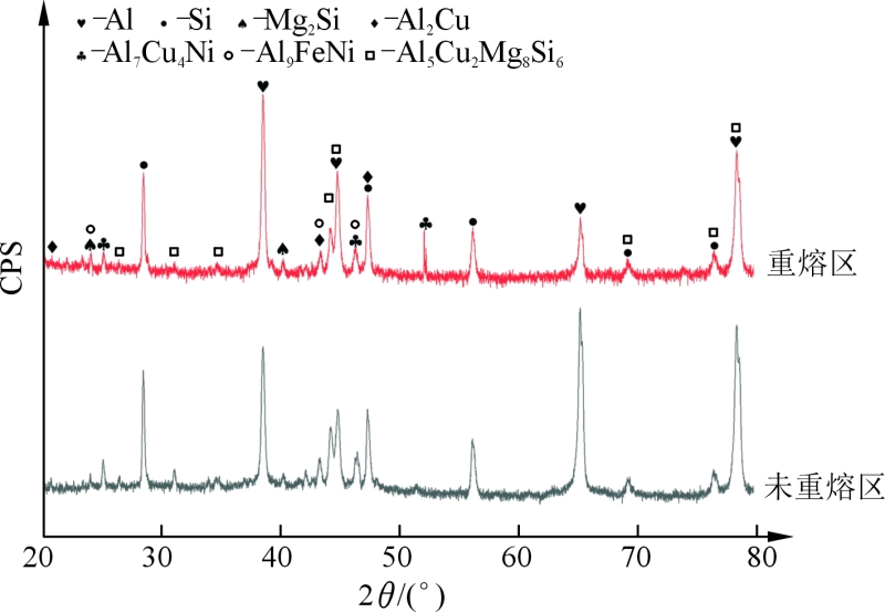 图3 试验合金重熔区与未重熔区的XRD图谱