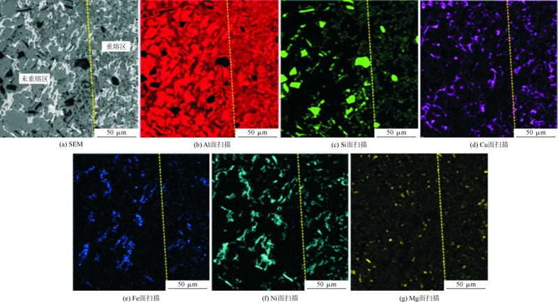 图5 重熔区和未重熔区界面处的SEM和EDS面扫描图