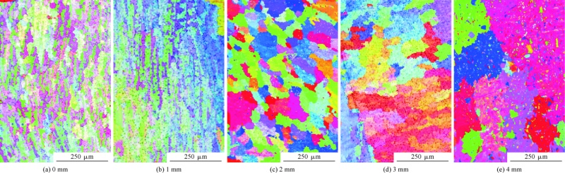图4 试验合金激光重熔后不同深度的SEM图 图5为重熔区与未重熔区界面处(3.5 mm处)的SEM图和EDS元素面扫描图。可以看出,重熔处理后,合金中的元素分布发生了明显变化。未重熔区中的Si元素主要以Si单质的形式存在,包括块状的初生Si相或针状的共晶相。重熔区的Si相呈细小连续不规则状分布,但仍有少量粗大初生Si相。这可能是由于重熔深度太深,激光热量较低,部分粗大的初生Si相没有完全熔化造成的 图6为试验合金激光重熔后距表面0、1、2、3与4 mm(未重熔区)的EBSD取向分布图。可以看出,激光重熔处理显著细化了合金的晶粒尺寸,同时随着距离表面深度的增加,晶粒尺寸有所增大。这主要是由于在激光重熔过程中,高能激光束连续搅动熔融物,产生许多非均质形核位置,细化晶粒结构。激光重熔具有能量高、冷却速度快的特点,与合金未重熔区相比,重熔区不同位置在短时内先后经受了大的过热和过冷度,有利于提高形核速率和抑制晶粒快速生长。