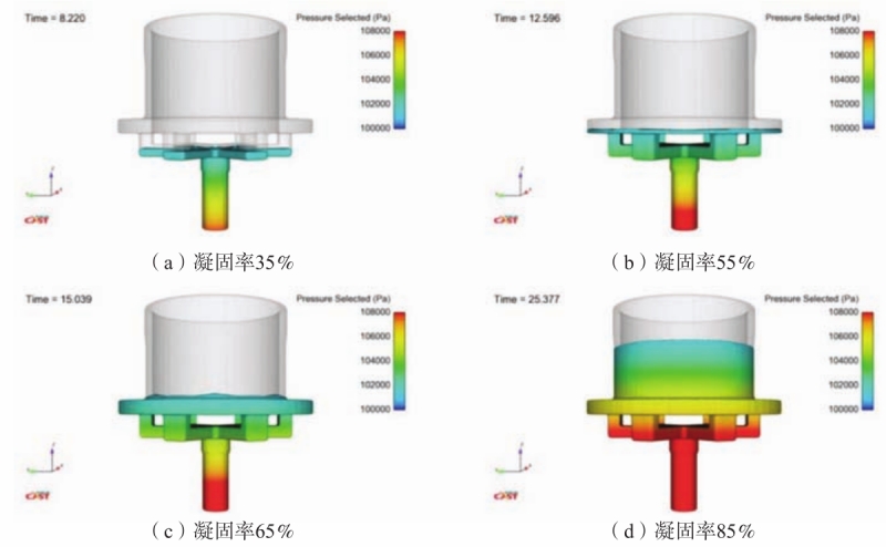 图3 监测点位置图 从充型压力场模拟(图4)看到:充型45%之前,各内浇道压力分布都较均匀,液面总体平稳上升,充型到55%时,法兰与内浇道压力差为1 000 Pa;充型65%时,铝液由法兰进入筒身时发生波动,呈现了不稳状态,法兰与内浇道压力差大于1 000 Pa。随着充型继续进行,各部位压力差稳定在1 000 Pa,如图4(d)所示。