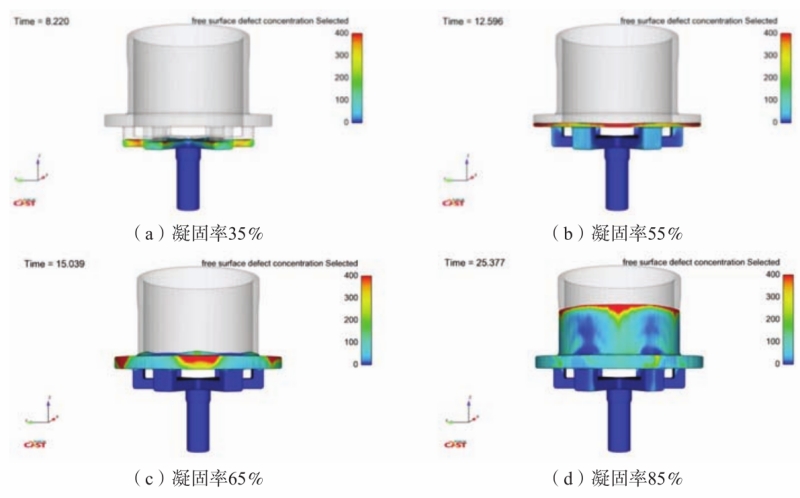 图13 充型过程速度场 氧化渣分布如图14所示。图14(a)-(b)中,铝液由升液管进入横浇道时氧化渣浓度为350 kg/m³,由横浇道进入铸型后浓度升高为400 kg/m³,氧化渣集中于内浇口之间,浓度基本不变。由于铝液流速不大,氧化渣没有被大量卷入法兰底部,随着充型过程的进行逐渐上浮至液面,法兰内氧化渣基本被排除。