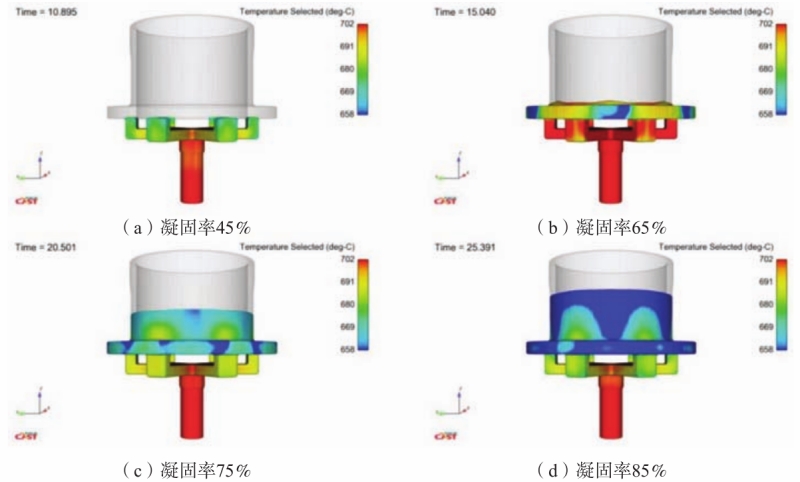 图14 氧化渣分布 充型时浇注系统及型腔内的温度分布数值模拟结果如图15所示,充型45%时浇注系统中的铝液温度在670~680 ℃之间。充型65%时,内浇口间铝液温度下降至660 ℃,内浇口处铝液温度为685 ℃,法兰温度差为25 ℃。充型大于75%后法兰与筒壁处温度基本持平。