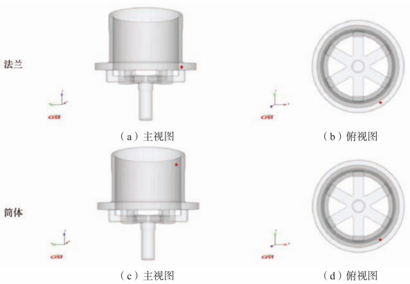 式中:A内为内浇道横截面积(cm²);G为铸件质量(g);ρ为铝合金密度(g/cm³);v为内浇口处线速度(为保证充填过程中不出现紊流为限度,一般取v≤15 cm/s);t为充满铸型所需时间(s)。 2.2 充型过程数值模拟分析 将工艺设计的实体三维模型转化为stl格式文件导入Flow-3D软件,并对工艺参数进行设置及网格划分。铸件材质为A356铝合金,模具为H13钢,传热系数:液态金属-模具之间为1 750 W/(m²·K),固态金属-模具之间1 000 W/(m²·K),边界条件设定为固壁边界。升液及充型压力21.5 kPa,充型时间21 s,凝固成型压力39.2 kPa,保压时间1 300 s。浇注温度为700 ℃,模具温度为100 ℃。 为探究铸件关键位置充型情况,在铸件法兰和筒体顶部分别设置监测点(红色标注),如图3所示。