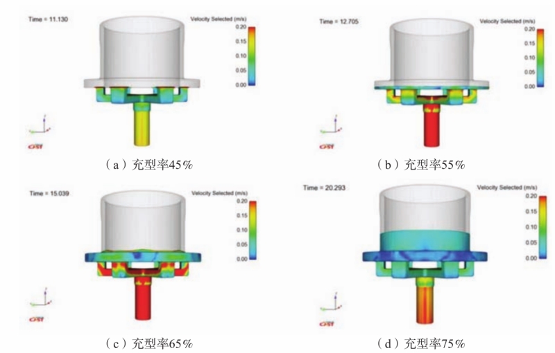 图4 充型过程压力场 再由充型过程速度场模拟(图5)看到:充型45%时,横浇道与内浇道内液体充填的速度差基本为0,液面平稳;充型55%时,法兰内液体充填速度差为0.05 m/s,此差值较小对金属液流动的平稳性影响可以忽略;充型到65%时,相邻内浇道之间、内浇道处金属液速度差增大为0.1 m/s,液面出现波动;充型超过65%后,铸型内金属液速度差基本为0,液面上升平稳。从整个充型过程的速度差变化可以发现,0.1 m/s的速度差是液面产生波动的最大值。