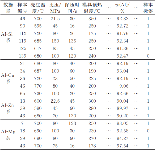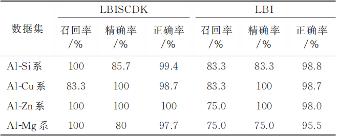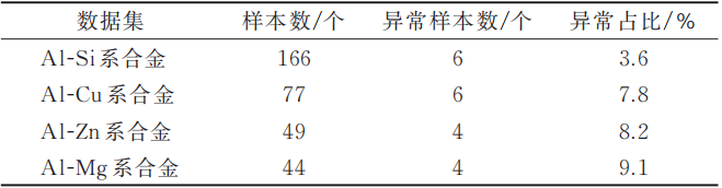 图7 工艺数据集关键属性的数据分布 校验材料成分数值步骤,发现Al-Zn系合金数据集中样本37的材料组分数值之和为102.46,其违反材料成分属性取值规则且明显不符合工程实际。基于挤压铸造工艺数据属性值的取值范围、数值类型等信息对数据样本进行正确性检测,发现4条异常样本(见表8,其中标签0代表正常,1代表异常),其中Al-Si系合金数据集的样本67和样本90的浇注温度数据偏离Al-Si合金的经验取值范围,核实数据源文献发现其为半固态挤压铸造工艺而非近液相线温度挤压铸造。Al-Cu系合金数据集中样本46的浇注温度数据偏离经验取值范围,Al材料成分数值也明显异常,核实数据源文献发现其为AZ91D镁合金的近液相线温度挤压铸造工艺数据。Al-Mg系合金数据集中样本37的浇注温度数值偏离经验取值范围。删除违反属性值取值规则的数据样本,然后将其余数据样本采用LBI集成模型进行二次检测,得LBISCDK方法的检测结果见表9。对相同数据集,只使用LBI集成模型的检测结果见表10。 表8 违反属性值取值规则的异常样本
