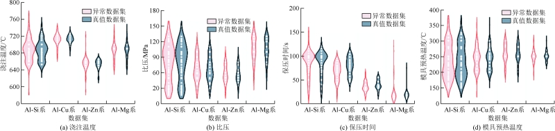 图6 LBISCDK方法检测流程 试验真值数据为本研究从CNKI、Web of Science等数据库检索的挤压铸造相关文献中提取整理的4个不同系列铝合金(Al-Si系、Al-Mg系、Al-Cu系和Al-Mg系合金)的近液相线温度挤压铸造工艺数据集,共332个样本,其中每个样本包含4个工艺参数属性(浇注温度、挤压压力、保压时间和模具预热温度)、5个铸件几何特征属性(挤压方式、形状复杂度、最大壁厚、最小壁厚和材料成分)和3个质量指标属性(抗拉强度、屈服强度和缩松缩孔率),见表5。对表5的工艺数据真值数据集通过生成随机异常偏移量来进行异常数据模拟添加,并通过设定异常数据比例来实现生成不同异常程度的待测数据集,算法的伪代码见表6。 通过在收集的铝合金近液相线挤压铸造工艺数据真值数据集中随机加入其他材料成分(如Cu合金、Mg合金等)或其他工艺方式(如半固态挤压铸造等)的工艺数据样本,以模拟在数据收集和整理过程中因操作失误而导致数据异常的情况。经过异常数据模拟添加后得到4个不同异常程度的异常数据集,见表7。真值数据集和异常数据集的4个关键属性的数据分布见图7。可以看出,相较于真值数据集,由于异常数据的存在,异常数据集中各属性的数据分布范围变大,即有异常数据超出原正常数值范围。 表5 挤压铸造工艺真值数据
