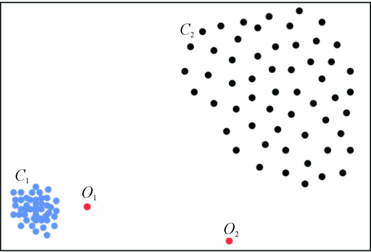 (1)LOF模型 LOF主要聚焦于数据点的邻域密度,将数据视为空间中的点,具有低密度的数据点视为异常点。如在以两个数据属性为坐标轴形成的二维空间中(见图1),C1和C2为两个正常的数据点簇,点O1、O2为两个离群的异常数据,其数据密度明显不同。因此如果一个样本点的密度比较小,而它周围临近样本点的密度都比较高,那么其可能是异常点(见图1中O1)。在本研究中,将挤压铸造工艺数据的属性抽象为坐标轴,形成LOF中多维空间的工艺数据样本点。为检测其中的异常样本,则需要计算数据密度。构建的检测挤压铸造工艺数据正确性的LOF模型的伪代码见表2。