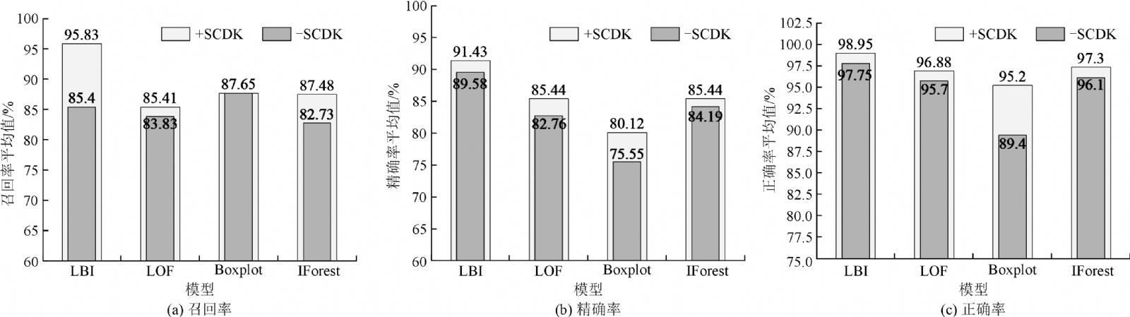 融合领域工程知识的LBISCDK方法和纯数据驱动的LBI方法各检测指标结果见表11。分析表11可得,LBISCDK方法在4个不同异常程度的异常数据集上的检测召回率、精确率和正确率的平均值分别为94.43%、95.23%和99.37%,其中Al-Zn系合金数据集的3个检测评价指标均为100%,说明该方法能够有效检测挤压铸造工艺数据集中的异常数据,检测效果可满足数据驱动相关应用需求。 图8为几种方法融合领域知识前后在4个异常数据集上的平均检测召回率、准确率和正确率。可见相较于纯数据驱动的检测方法,融合领域知识后的方法检测效果均有一定提升,异常数据召回表现尤其优秀;其中LBI、LOF和IForest方法的平均召回率分别提升了10.43%、1.58%和4.75%,LOF和Boxplot方法的平均精确率分别提升了2.68%和4.57%,Boxplot方法的平均正确率提升了5.6%,表明领域知识和数据驱动相结合能够对挤压铸造工艺数据集中的异常数据进行更加有效的识别,可为数据驱动的挤压铸造工艺参数设计等数据驱动应用提供高质量的数据样本。 表11 异常检测结果