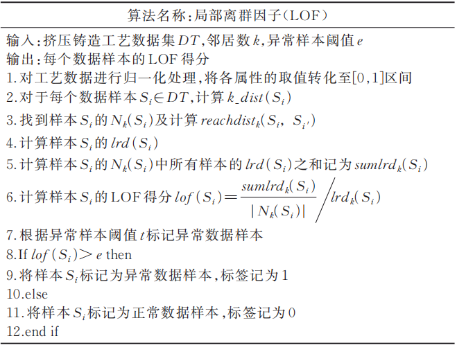图2 LOF示意图 表2 检测挤压铸造工艺数据正确性的LOF模型伪代码