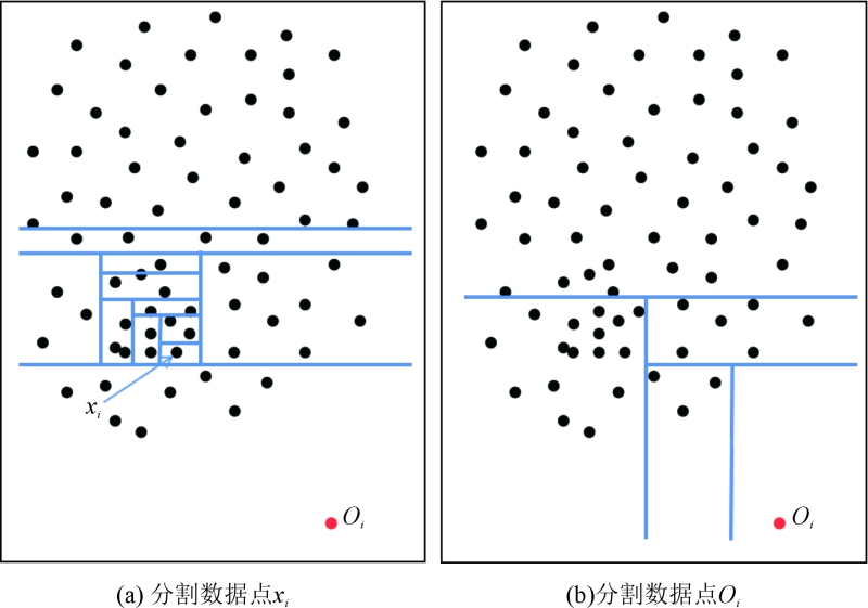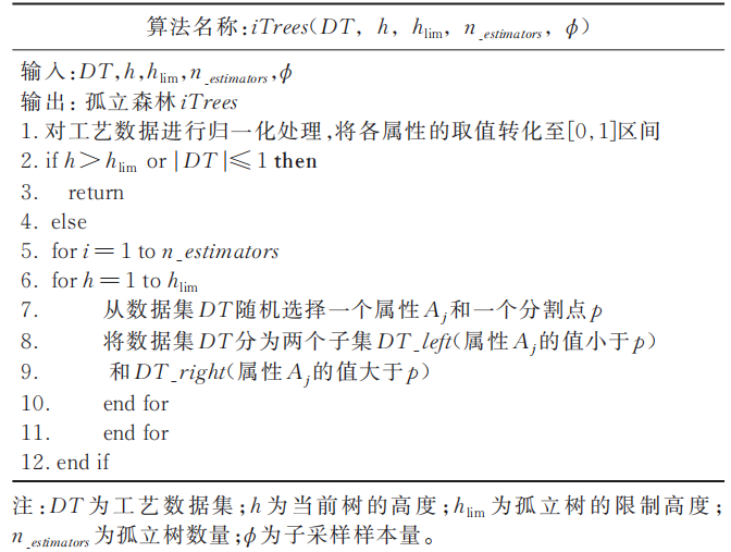 (2)IForest模型 IForest是一种基于树结构的异常检测方法,由预设的多棵隔离二叉树iTree组成,其利用数据点被二叉树分割的次数来度量一个点是聚集(正常)还是孤立的(异常)。图3为随机分隔数据点。从图3a可知,对于数据集群中的正常点xi,需要对其进行多次随机分割才能隔离出来;而对于异常点Oi,见图 3b,仅需要对其进行几次分割就可以隔离出来。基于IForest的挤压铸造工艺数据正确性检测过程主要分为训练和评估两个阶段,见图4。训练阶段生成指定数目的孤立树,其伪代码见表3。