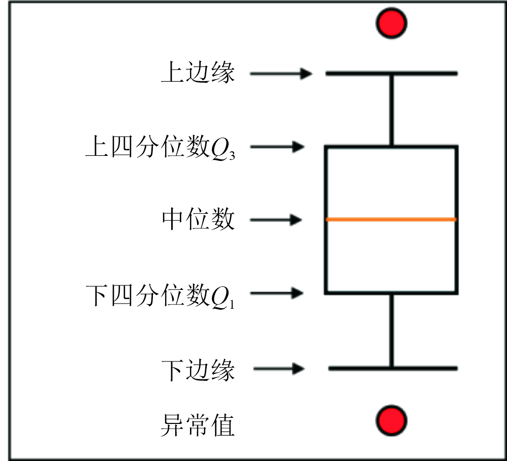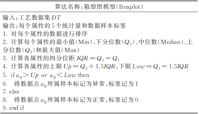 (3)Boxplot模型 通过箱型图(Boxplot)可以直观了解数据的集中趋势、离散程度和异常值情况,将异常大或异常小的极端值识别为异常值。图5为箱型图示意图。下四分位数Q1、上四分位数Q3分别指一组属性值按从小到大顺序排列后,处于25%、75%位置的数值,四分位距定义为IQR=Q3−Q1,各属性上边缘为Q3+1.5IQR,下边缘为Q1−1.5IQR,将超过上下边缘区间的数据识别为异常值,标记为1,其余正确数据标记为0。基于以上原理,构建的检测挤压铸造工艺数据正确性的Boxplot模型的伪代码见表4。