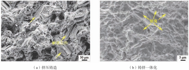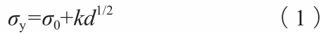 图7 ZK60合金的断口形貌 2.3 强化机理 铸挤一体化ZK60合金的平均晶粒尺寸为1.81 μm,仅为挤压铸造合金平均晶粒尺寸的3.5%,晶粒细化程度显著。较小的晶粒尺寸可有效提高合金的屈服强度,晶粒尺寸对屈服强度的贡献可通过霍尔-佩奇公式进行估算: