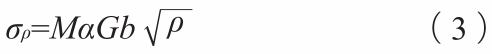 式中:G和b分别为镁合金的剪切模量和柏氏矢量,这里分别取为1.66×104 MPa和3.2×10¯¹º m;f为第二相的体积分数,通过IMAGE J软件计算得到其值为10.2%;di为第二相的平均直径,为3.03 μm。计算得出第二相对屈服强度的贡献约为25 MPa。从图4(c)可知,在挤压过程中,ZK60合金内部存在不均匀变形,为了协调合金塑性变形引起的不均匀变形产生了大量的缠结位错,即几何必需位错,几何必需位错是提高ZK60合金屈服强度的重要因素,位错强化可由公式(3)计算: