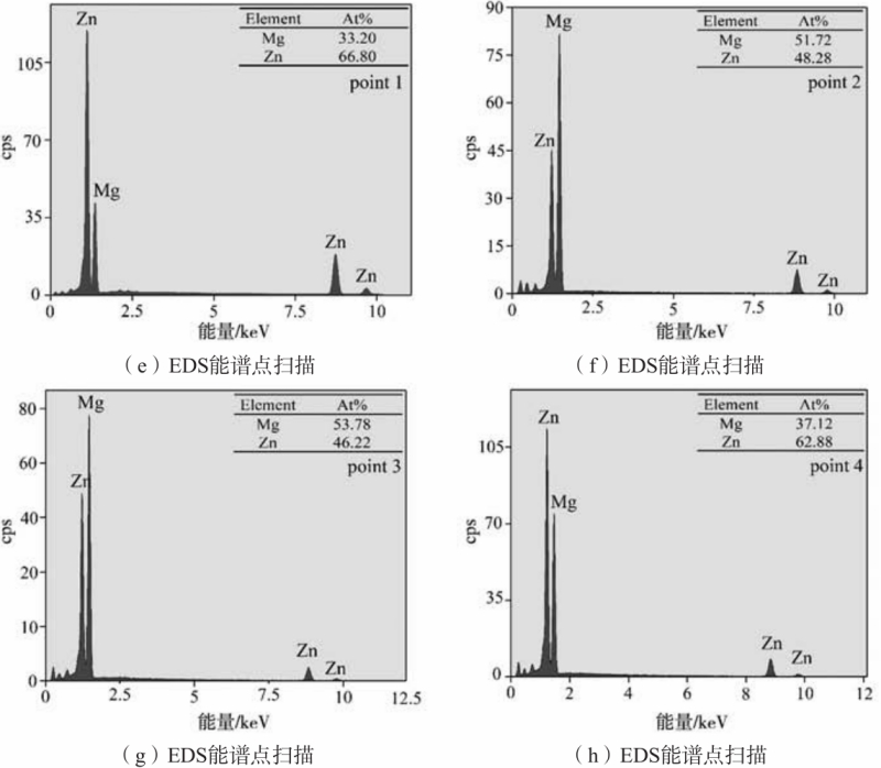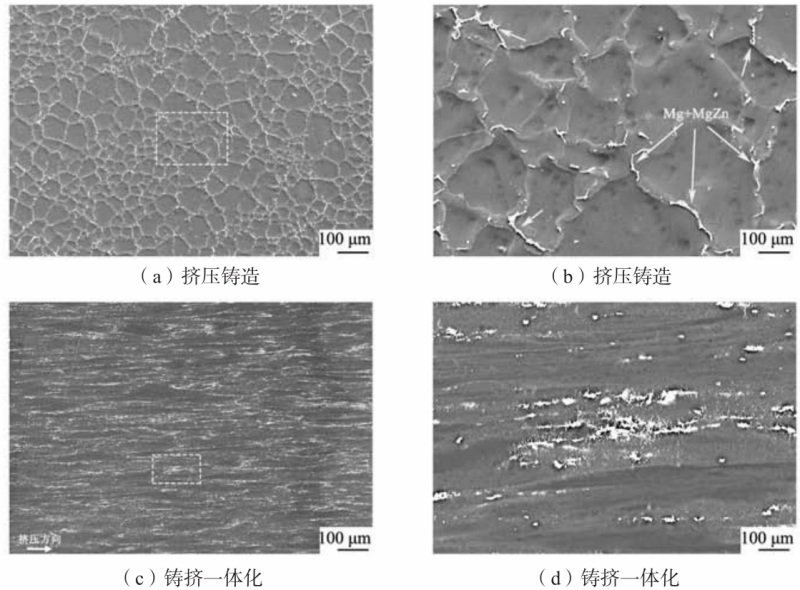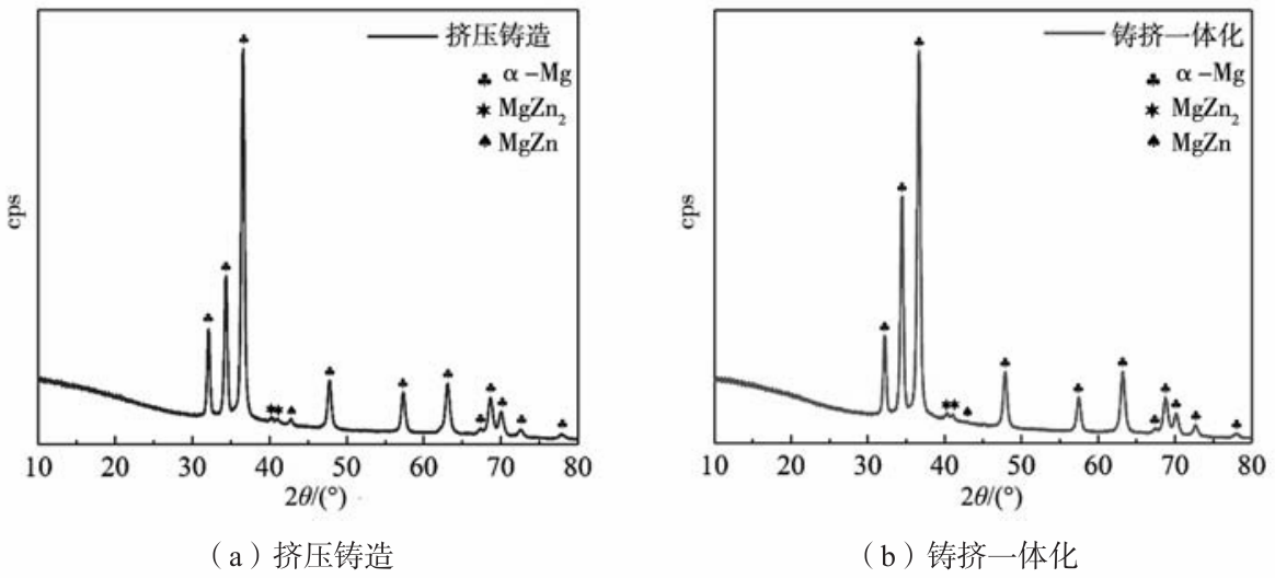 图1 铸挤一体化成形工艺流程示意图 1.3 组织表征与性能检测 采用X射线衍射仪(XRD,RD-7000)分析合金的相组成。2θ的范围为20°~80°,扫描速度为3°/min。采用光学显微镜(OM,DMM-490C)及配备了能谱仪(EDS)和电子背散射衍射(EBSD)的扫描电镜(SEM,Gemini SEM300)观察并表征样品的微观组织形貌。EBSD 分析样品通过精密刻蚀镀膜仪(PECS II685)制备。抛光过程为:先在电子枪角度6°和电压6 kV条件下进行0.5 h,随后在3°和电压3 kV条件下进行0.5 h。EBSD数据通过Aztec Crystal进行分析。在万能材料试样机(C45.105EY)上以2.5×10¯4 s¯¹的应变速率进行室温拉伸测试。拉伸试样为狗骨形状的试样,其直径为5 mm,标距长度为30 mm。每组试样进行三次相同的测试,并取平均值。拉伸后,采用SEM对断口形貌进行观察和分析。 02 试验结果与讨论 2.1 相鉴定与微观组织 图2 是通过挤压铸造和铸挤一体化成形制备的ZK60合金的XRD图谱。通过XRD图谱,可以看出ZK60合金的相组成主要有α-Mg、MgZn2和MgZn相。与挤压铸造工艺相比,经铸挤一体化后,ZK60合金的相组成没有发生明显变化。图3显示的是通过挤压铸造和铸挤一体化成形制备的ZK60合金的微观组织。图3(a)-(b)是挤压铸造ZK60合金的微观组织。可以看出,挤压铸造ZK60合金的微观组织并不是很均匀,主要由粗大的先结晶的晶粒和细小的二次结晶晶粒组成,这种现象的产生主要是挤压铸造的高冷却速度所致。挤压铸造ZK60合金中的第二相主要沿晶界分布,呈细小片状、破碎条块状和颗粒状。铸挤一体化后的ZK60合金微观组织如图3(c)-(d)所示。可以看出,第二相沿着挤压方向呈流线型分布。经过强烈的塑性变形后,第二相被破碎,变得细小且弥散分布。根据EDS能谱点扫描与XRD分析结果,颗粒状的第二相主要是MgZn2相,破碎条块状的第二相是α-Mg+MgZn共晶相,如图3(e)-(h)所示。