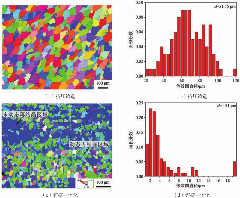 图3 ZK60合金的微观组织及EDS图谱 图4为通过EBSD测得的挤压铸造和铸挤一体化ZK60合金的反极图(IPF图)和晶粒尺寸分布图,其中晶粒的不同颜色代表晶粒的不同取向。如图4(a)-(b)所示,挤压铸造ZK60合金的晶粒尺寸较大,晶粒尺寸分布范围在20~120 μm之间,其平均晶粒尺寸为51.75 μm。对于铸挤一体化ZK60合金,其微观组织具有明显的“双峰结构”特征,即微观组织由粗大、拉长的未动态再结晶(unDRX)晶粒和细小的动态再结晶(DRX)晶粒组成。unDRX晶粒大部分呈蓝色,其<011- 0>晶向平行于挤压方向。细小的DRX晶粒分布于大晶粒的边界处及其中间区域,几乎全部为等轴晶粒。铸挤一体化ZK60合金的平均晶粒尺寸相对于挤压铸造合金大幅降低,降低至1.81 μm,这势必会使其力学性能大幅提升。图5为铸挤一体化ZK60合金的晶粒取向扩展图(GOS)。GOS≤1°的晶粒(以GOS色标标记)可以看作动态再DRX晶粒,而GOS>1°的晶粒这里归为其他类型的晶粒,以带衬度(Band Contrast)色标标记,由此统计,铸挤一体化ZK60合金的动态再结晶分数为52.27%。