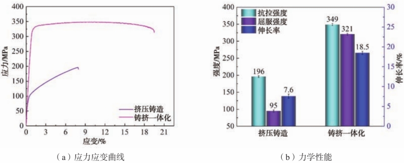 表1 ZK60合金化学成分 1.2 试验方法 首先,将上述金属原材料在N2+SF6保护气氛下,在电阻炉中熔化得到ZK60合金。随后,将合金熔体倒入预热温度为100 ℃的模腔中,并施加100 MPa的压力,待熔体完全凝固后得到挤压铸造坯料。一部分坯料冷却到350 ℃时,取出凹模下方出口处的顶杆,进行热挤压,得到铸挤一体化棒料。挤压速度为7 mm/s,挤压比9∶1。需要说明的是,挤压铸造和热挤压均在同一模具中完成。图1为铸挤一体化成形工艺流程示意图。