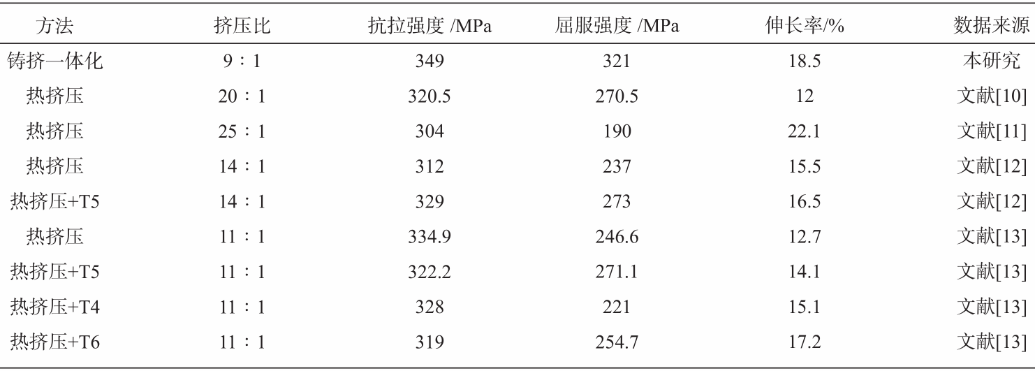 图5 铸挤一体化ZK60合金的晶粒取向扩展图 2.2 力学性能与断口形貌 图6为挤压铸造与铸挤一体化ZK60合金的拉伸工程应力-应变曲线和拉伸性能。挤压铸造ZK60合金的抗拉强度、屈服强度和伸长率分别为196 MPa、95 MPa和7.6%;铸挤一体化后,ZK60合金的抗拉强度、屈服强度和伸长率分别提高了78%、241%和144%,达到了349 MPa、321 MPa和18.5%。表2为采用铸挤一体化工艺制备的ZK60合金与其它研究中采用传统热挤压工艺制备的ZK60合金的性能对比。可以发现,采用铸挤一体化工艺所制备的ZK60合金的抗拉强度和屈服强度都明显高于其他研究的结果,同时伸长率也较高,但略低于peng等人的报道。值得注意的是,本研究采用的挤压比为9∶1,且合金未进行热处理,这说明采用铸挤一体化工艺所制备的ZK60合金综合性能高于先前报道的采用传统热挤压制备的ZK60合金,而且无需热处理就能达到很高的强度和韧性。图7为挤压铸造与铸挤一体化ZK60合金的室温拉伸断口形貌图。挤压铸造ZK60合金的断口形貌由较多河流状解理台阶和较浅的韧窝组成,解理台阶的平均宽度约为52 μm。铸挤一体化ZK60合金的断口形貌呈现典型的韧性断裂特征,即断口形貌由大量深而大的韧窝组成,韧窝的最大直径超过10 μm,这与铸挤一体化ZK60合金的高韧性相吻合。