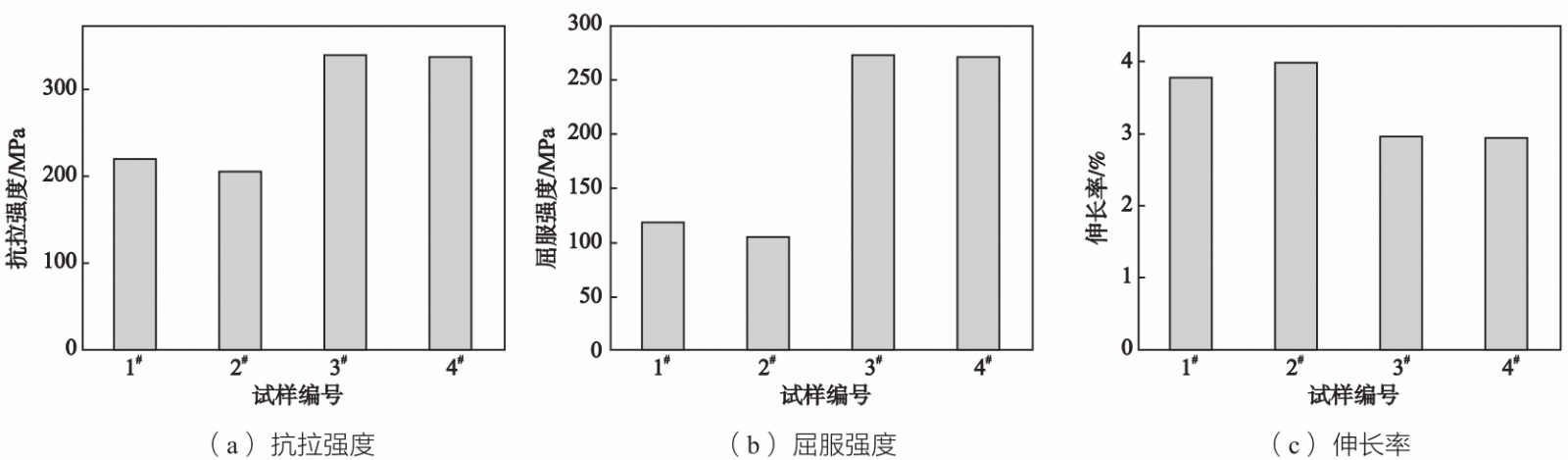 图1 铝合金金相组织图 综上所述,较高的冷却速率下(模具温度为25 ℃),Al-Si-Cu-Mg合金经过了T6热处理,硅原子发生了快速扩散,共晶Si逐渐球化,但由于小硅颗粒扩散到共晶硅中,硅颗粒的平均尺寸增大。在模具温度为200 ℃时,硅元素有足够的时间扩散到共晶硅中,因此硅粒子的数量没有明显变化。而在铸态铝硅合金中,共晶硅颗粒的形态对力学性能起着重要作用。 2.2 力学性能分析 2.2.1 室温力学性能 通过拉伸试验研究了模具温度和热处理对合金力学性能的影响,拉伸试验结果如图2所示。在铸态试样中,1#试样由于模具温度为25℃,其抗拉强度与屈服强度比2#试样高,而伸长率比2#低0.15%。而经过热处理后的3#试样与4#试样的抗拉强度与屈服强度较铸态试样有明显提高,而伸长率略有降低。热处理后的3#试样与4#试样的三个力学性能的差距不大,这是由于经过热处理后,3#试样与4#试样共晶硅颗粒形状和大小趋于一致,所以在力学性能上也趋于一致。