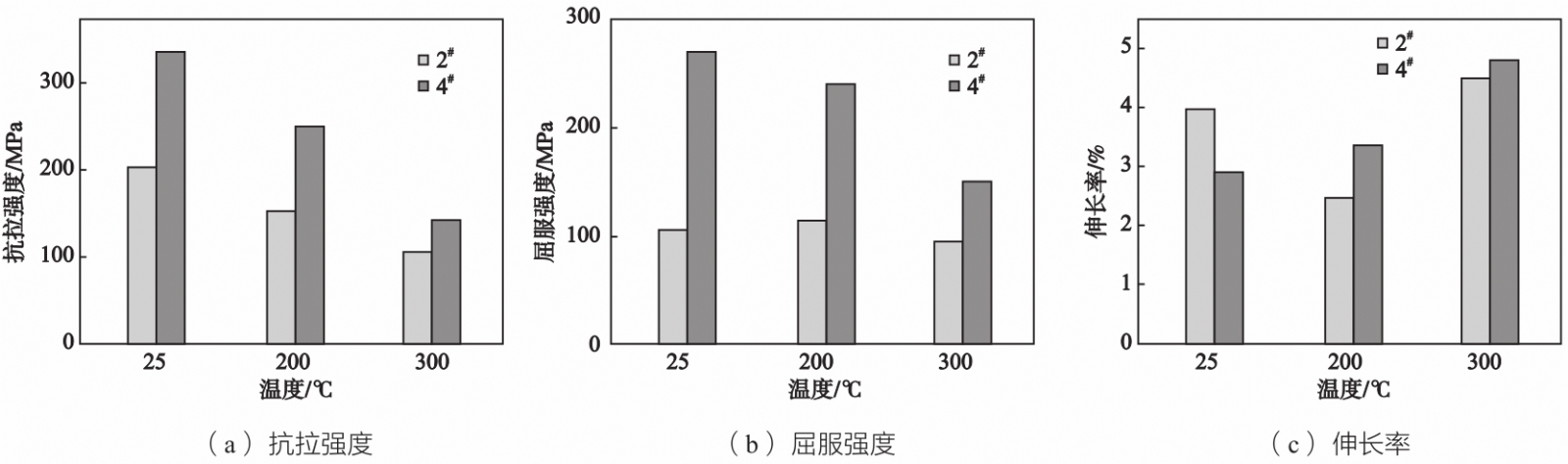 图2 铝合金室温力学性能 2.2.2 高温力学性能 图3所示为模具温度为200 ℃下铸态与热处理后2#、4#试样不同温度力学性能。从图3a可以看出,随着温度的升高,2#、4#试样的抗拉强度逐渐降低;2#试样的屈服强度在三个温度下差别不明显,在200 ℃时略有上升。4#试样屈服强度随着温度的升高而降低;2#试样伸长率随着温度的升高先降低后升高,在300 ℃时可以达到4.5%,而热处理后4#试样随着试验温度的升高而增加,最高达4.8%。
