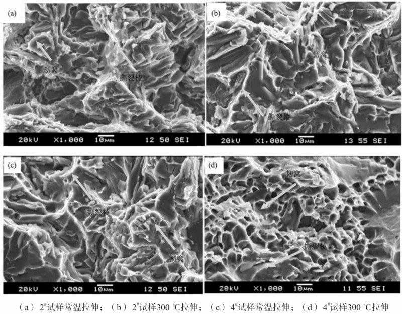 图3 铸态与热处理后试样不同温度力学性能 图4为铝合金断口形貌,从图中可以看出,室温下图4a、c显示了相似的断裂行为,断口由基体中的微孔洞、撕裂棱和二次裂纹组成。从断口形貌来看,随着测试温度从25 ℃提高到300 ℃,断裂特征由混合断裂转变为韧性断裂,带有韧窝和撕裂棱的微孔洞增加,二次裂纹减少。这表明基体软化,合金强度降低,但延性增加。当温度升至300 ℃时,基体比室温时软得多。与此同时,局部塑性变形产生了孔洞,并使孔洞膨胀。