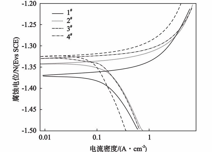 图4 铝合金断口形貌图 2.3 电化学结果及分析 图5为各个试样的极化曲线,从图5中可以看出,热处理后的试样整体要比热处理前耐腐蚀性能要好。热处理前,模具温度较低的25 ℃,试样耐腐蚀性较好;而经过热处理后模具温度为200 ℃时,试样耐腐蚀性最好,说明热处理有助于提高耐腐蚀性能,而25 ℃下经过热处理后的铸造铝合金材料性能是最好的,这与铝合金的力学性能趋势基本保持一致。