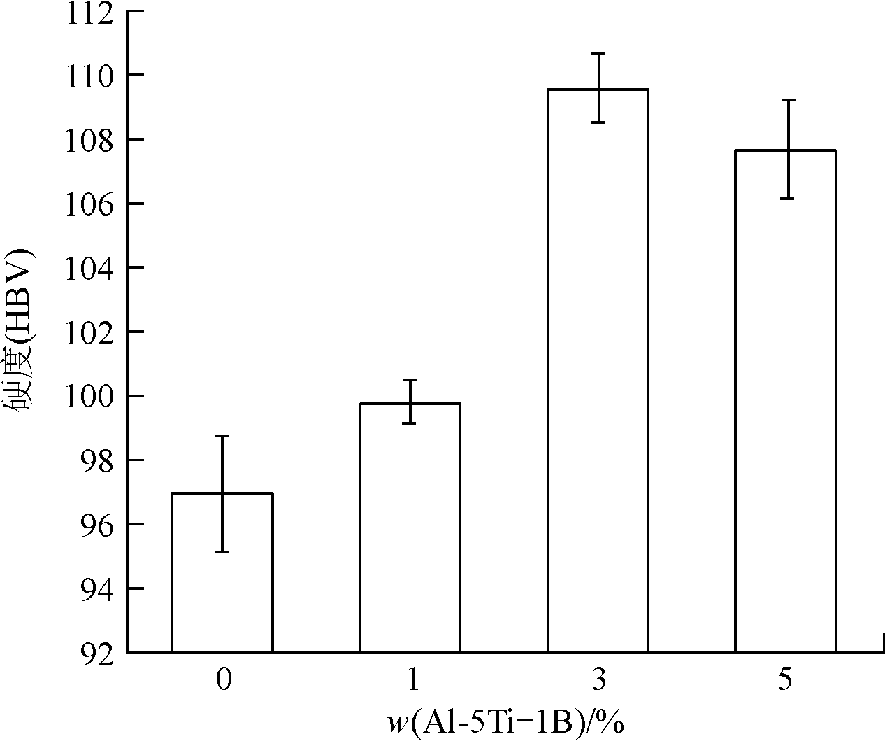 图10 不同Al-5Ti-1B添加量时TiB2/ADC12复合材料试样硬度