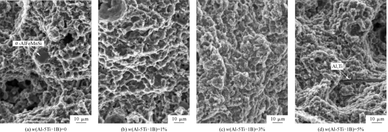 图7 不同Al-5Ti-1B含量的TiB2/ADC12铝合金SEM形貌