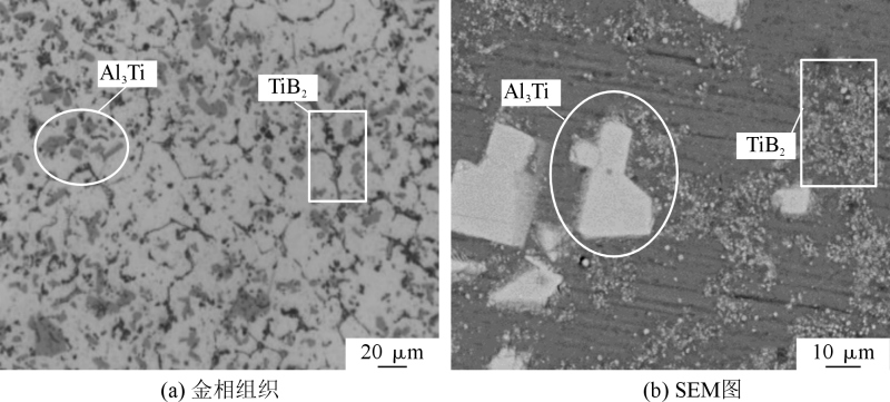 图4 Al-5Ti-1B中间合金微观组织 图5为添加不同含量Al-5Ti-1B中间合金的TiB2/ADC12铝合金典型金相组织。图6为α-Al晶粒尺寸统计。图7为添加不同含量Al-5Ti-1B中间合金的TiB2/ADC12铝合金的SEM形貌。图8为图7局部区域对应的放大形貌及EDS能谱。由能谱分析可知,粗大块状相主要含Fe、Mn和Si等元素,针状相主要包含Al和Ti元素,推测针状相主要是凝固过程形成的Al3Ti相。结合相关研究分析可知,块状相主要是α-AlFeMnSi相。以上结果表明,Al-5Ti-1B可以形核细化α-AlFeMnSi相。