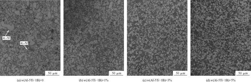 图5 不同Al-5Ti-1B含量的TiB2/ADC12铝合金的金相照片