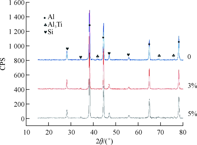 图9 不同Al-5Ti-1B添加量下TiB2/ADC12铝合金XRD图谱