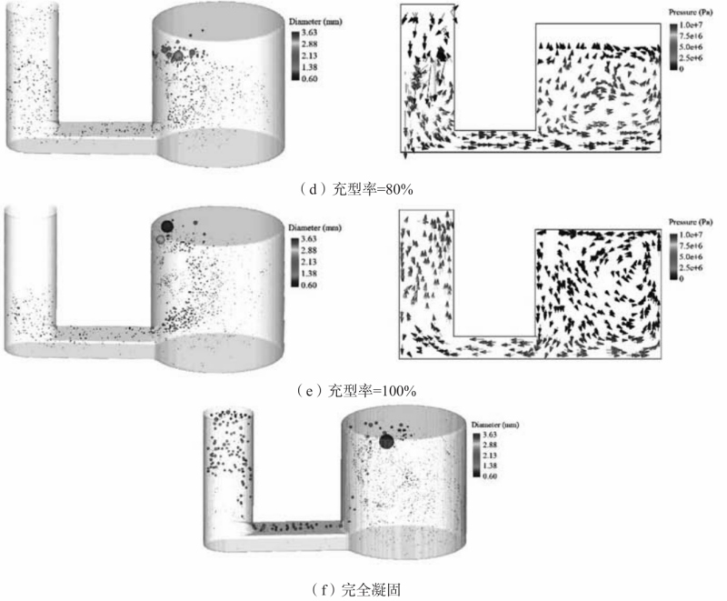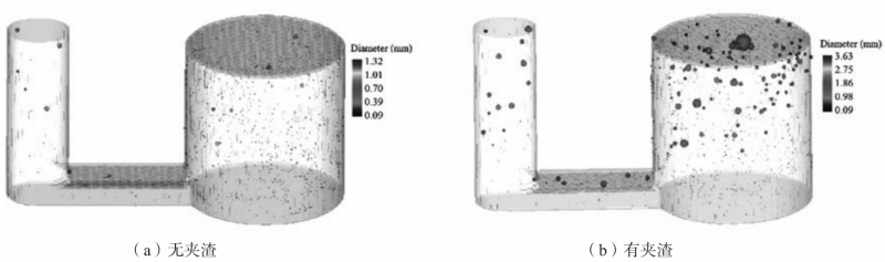 图6 渣气复合体粒径分布和流场 图6a、b为充型初始阶段,外部引入的渣粒随金属液快速进入型腔中,此时在浇注系统中的渣粒体积变化不大,且呈弥散形分布,而在圆柱试样上层液面区域开始出现粒子的聚合长大。其原因是由于直浇道和横浇道区域的流速较大,渣粒之间的聚合长大不明显。而在试样上部液面区域的流速显著降低,使得渣粒之间的碰撞聚合长大较为明显。由于充型初期金属液温度变化不大,在此期间氢气在渣粒表面的吸附量也较小,在这个阶段中渣气复合体的体积变化主要是以渣粒间的聚合长大为主。图6c-e为充型中后期阶段,直浇道与横浇道内的流速有所减缓,可以看到因渣气复合而形成的粒子体积增加。同时内浇口区域的流速显著降低,这使得该区域开始出现渣气复合体的快速聚合长大(图6e)。在此期间,渣气复合体不断向上方运动,其聚合体积进一步加大,从而在试样顶部可以看到有较多大体积的渣气复合体的存在。图6f表示完全凝固后渣气孔的分布,从图中可以看到,直浇道和横浇道内的渣气复合体体积有了明显的增加。同时,试样顶部的渣气孔分布也较为明显,且体积较大,而试样中下部区域的渣气孔数量较少,且体积较小。其原因是由于在凝固阶段金属液温度不断降低,促使熔体中的氢大量析出并吸附于渣粒表面,渣气复合体中氢气含量的不断上升使得其密度减小,促进了渣气复合体向试样上部的移动。与试验结果对比,模型计算所获得的渣气孔分布规律及形貌特征与实际基本吻合。 2.4 夹渣对渣气孔形成的影响 为了研究外来夹杂的引入对铸件中渣气孔形成和分布的影响,采用相同的工艺条件分别计算了无夹渣和有夹渣进入的条件下铸件内气孔和渣气孔的分布,结果如图7所示。