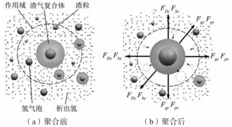 图2 渣气聚合长大原理图 在每一个时间步中,处于复合体作用域内的氢气泡、析出氢、渣粒及渣气复合体之间将触发聚合运算,且遵循大粒子吞并小粒子、复合体吞并渣粒和气泡的规则,最终形成一个体积更大的渣气复合体,同时每个复合体的作用域大小随复合体的直径及渣气比等动态变化。基于复合体的受力分析,复合体的运动控制方程如下: