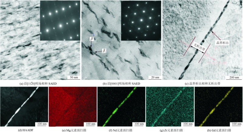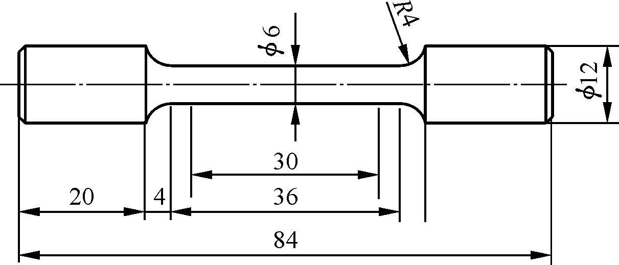 图1 力学性能试样尺寸示意图 图2为EV31A合金铸态物相和组织分析。图3为EV31A合金固溶态及时效态的金相和SEM组织分析。经520 ℃×10 h固溶及60 ℃水淬处理后,晶粒形貌由不规则的等轴晶转为规则的六边形,平均晶粒尺寸由铸态的65.02 μm增长到74.33 μm,平均晶粒尺寸增加了12.5%。图4为EV31A合金峰时效TEM分析。由图4明场像及选区电子衍射(SAED)可以看出,合金组织中含有薄片状的析出相,其长度为30~40 nm,板厚为3~5 nm。