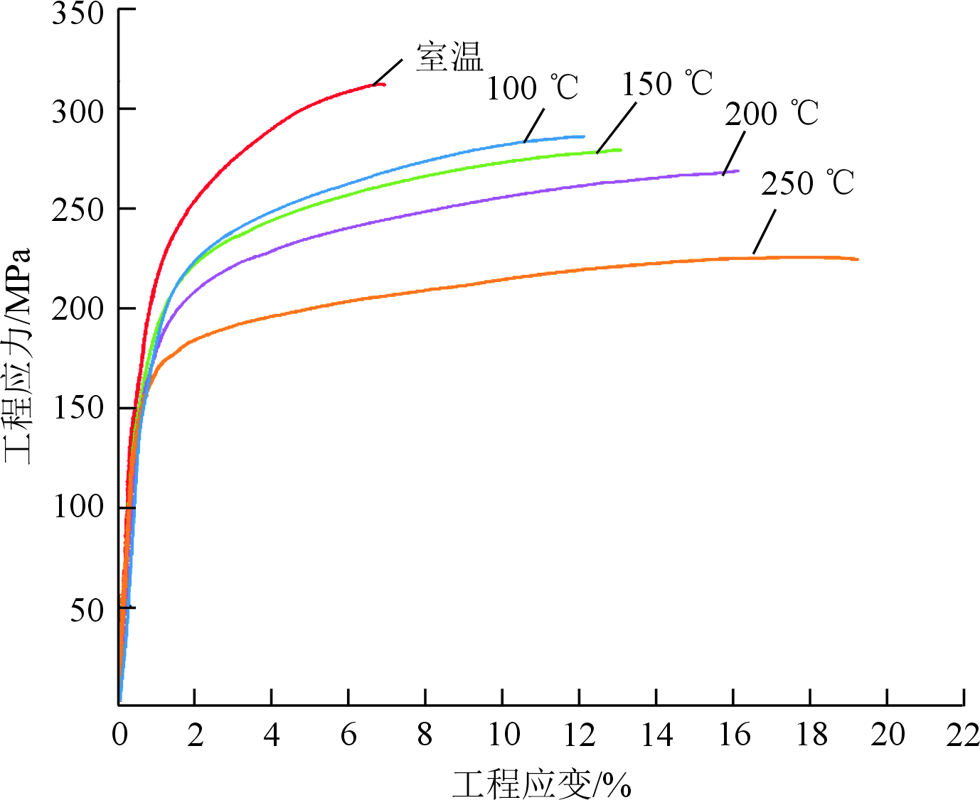 图5 不同温度下EV31A合金的工程应力-应变曲线