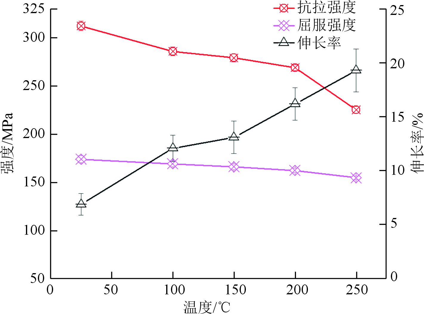 图6 温度对EV31A合金力学性能的影响