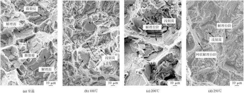 图4 EV31A合金峰时效TEM及HAADF分析 发动机系统机匣类铸件内有多处油路,使用温度低于200 ℃。图5为EV31A合金室温到250 ℃下工程应力-工程应变曲线。可以看出,在测试温度范围内,应力随应变迅速增加,屈服后缓慢增加,均未出现加工软化现象。图6为温度对EV31A合金力学性能的影响。与目前常用的ZM6合金相比,在相同铸造条件下,EV31A合金的抗拉强度提高了20%,屈服强度提高了40%,而伸长率略高于ZM6。采用差压铸造的大型EV31A合金铸件具有较好的综合力学性能,且性能均匀性较高,各项误差均小于5%。铸件经荧光、X光及工业CT检测冶金质量好,热裂、偏析等缺陷倾向性小,适合于大型复杂砂铸机匣类铸件生产。 图7为EV31A合金室温及高温断口SEM形貌。可以看出,室温下,断口由大的解理面和撕裂棱组成,同时断口上有微裂纹,室温下断裂模式为典型的解理断裂。