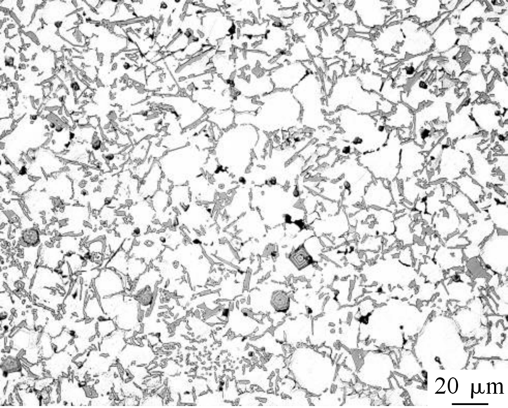 对改进后的方案进行数值模拟,一般用二次枝晶臂间距值来反映铸件的力学性能,方案改进前后二次枝晶臂间距对比见图9。可以看出,优化前铸件的二次枝晶臂间距最大值为42.56 μm,优化后铸件的二次枝晶臂间距最大值为36.88 μm。二次枝晶臂间距值减小了13.35%,可见由于冷却系统的添加,凝固温度梯度得到优化且凝固时间缩短,铸件力学性能提高。 改进方案前后铸件缩松缩孔缺陷分布见图10。可以看出,铸造工艺改进前,缩松、缩孔分布较多,铸件成形质量不佳,力学性能差。通过改进浇注系统和添加冷却系统,缩松缩孔判据值减小到低于1,铸件缩松、缩孔缺陷基本消除,凝固温度梯度得到优化且凝固时间减少,得到的一体式车体铸件质量、力学性能更好,缺陷更小,证明了此工艺方案的合理性。 工艺方案改进后,在试制车体数值模拟缺陷最严重处取样,见图10b箭头处,该位置的金相图见图11。可以得出车体内已无明显缩松、缩孔现象,铸件力学性能明显改善。 综上,通过添加冷却系统,体积较大、分布较集中的缺陷已基本消除,且凝固时间大幅缩减,提高铸件生产效率的同时减小了铸件的二次枝晶臂间距值,起到了细化晶粒、提高铸件整体力学性能的作用。方案改进前后的铸件质量评价指标对比见表3。