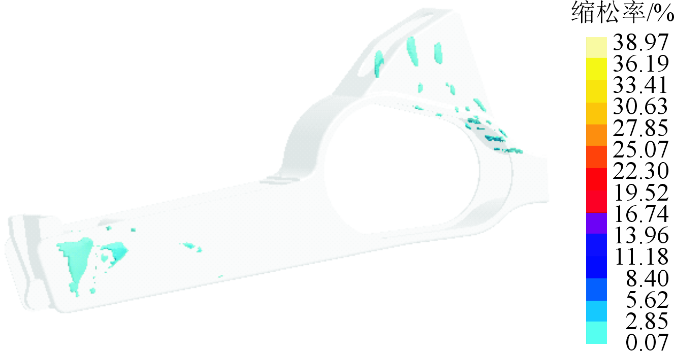 经过多次模拟对比,选择铸件与砂芯的传热系数为500 W/(m2·K),铸件与模具之间的传热系数为2 000 W/(m2·K),砂芯与模具的传热系数为300 W/(m2·K),模具间的传热系数为3 500W/(m2·K)。环境温度取20 ℃,开模温度取540 ℃,其他参数见表1。充型过程温度场见图4。 凝固过程产生的缩松、缩孔缺陷见图5。由于铸件两内浇道距离中心内浇道过长,使得铸件难以补缩,最终形成孤立液相区,从而产生缩松、缩孔缺陷。 铸件凝固过程温度场见图6。可以看出,由于铸件本身壁厚不均,结构复杂,导致铸件凝固过程无法实现自上而下顺序凝固,部分地方温度不均匀,出现热节。