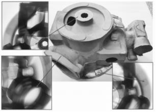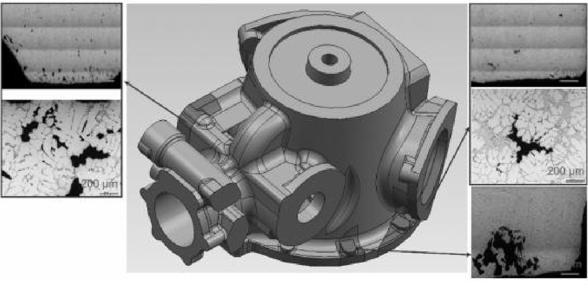 图2 铝合金后盖铸件铸造工艺 02 存在问题及缺陷分析 生产过程中,铸件常出现气孔和缩孔缩松等铸造缺陷,质量不稳定,铸件的一次性合格率低。经剖切检测,在铸件热节处出现大量的缩孔,在底部法兰处也出现了气孔等缺陷。部分缺陷位置见图3。