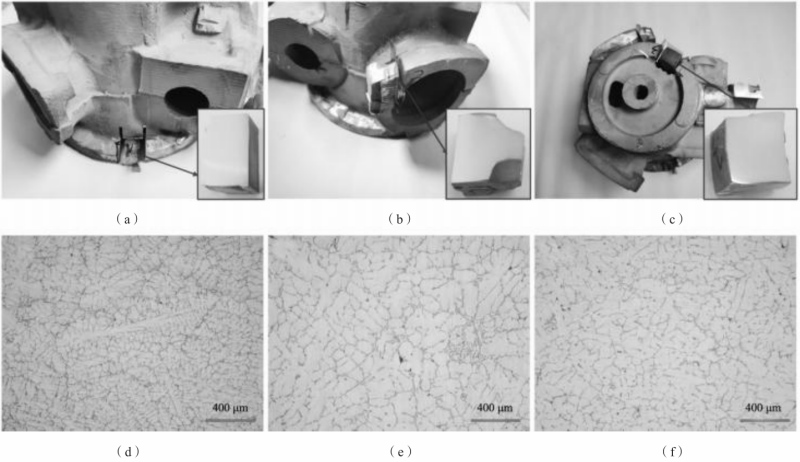 图10 铸件及X射线探伤 图11为不同取样位置和对应的剖面图片及金相图,见图11(a)-(c)的右下角。从剖面图片和金相结果可以看出,在这几个关键铸件位置均无缩孔、缩松和气孔缺陷。图11(a)处由于处在底部位置,晶粒组织较为细小;而位于铸件中部贴边冒口附近的剖面和顶部位置剖面晶粒尺寸较为粗大,但均未发现缺陷,如图11(d)-(f)所示。根据优化工艺方案进行了开模试制,投入生产50件,铸件成品率在60%以上。