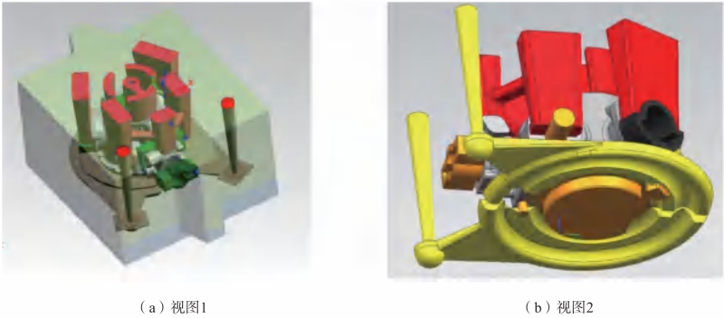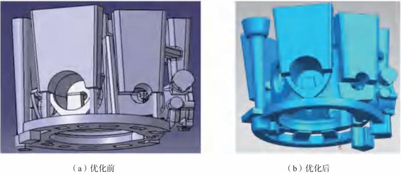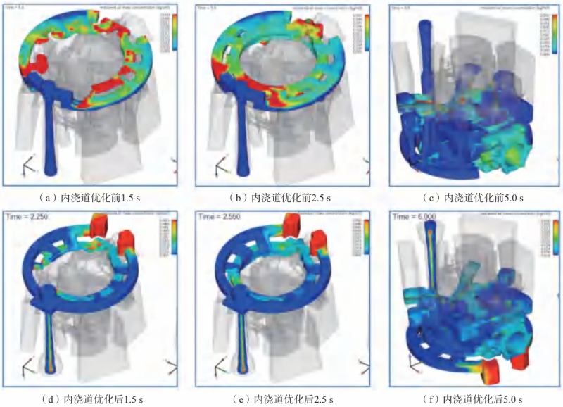 图6 内浇道的优化设计 图7为内浇道优化前后的卷气分析。从图中可以看出,在充型开始阶段,金属液前端存在大量卷气位置(红色区域),见图7(a)和(b)。金属液由内浇口进入铸件型腔时,容易直接冲击砂型,即底部法兰内侧面的位置,金属液前沿较不平稳,可能产生卷气或带来夹渣风险。随充型的进行,卷气有所减少,但铸件液面前端仍存在较多卷气区域,如图7(c)所示。