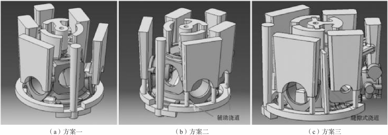 图3 铸件缩孔缺陷位置及光镜图 03 缺陷解决方案 3.1 基于改善顺序凝固的铸造工艺设计 由于铸件尺寸属于中小型铸件,因此考虑采用单直浇道,分别设计了三种工艺方案。其中方案一为在原始工艺(图2)的基础上,将双直浇道改为单一直浇道,如图4(a)所示。冒口沿用原始工艺的方案。由于ZL105合金的结晶温度范围较宽,因此冒口需要有足够的金属液进行补缩。而对于方案一,冒口中金属液需要流经铸件,待铸件完成充型后,金属液再进入顶部冒口。因此金属液流动路径较长,进入冒口的金属液温度会大幅下降,从而影响补缩效果。而铸件部分可能因为大量金属液流过而产生局部过热,形成缺陷。因此,在方案二图4(b)中增加了辅助浇道。在充型过程中,金属液可从横浇道直接进入侧冒口。在方案三图4(c)中,增加了两组对称的缝隙式浇道,一方面提高铸件筒形部分的充型和补缩能力,另一方面温度较高的金属液可经由缝隙式浇道进入铸件顶部冒口。