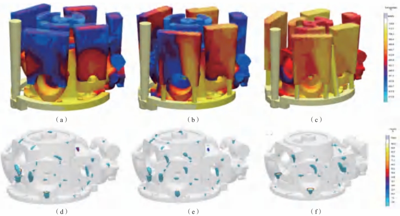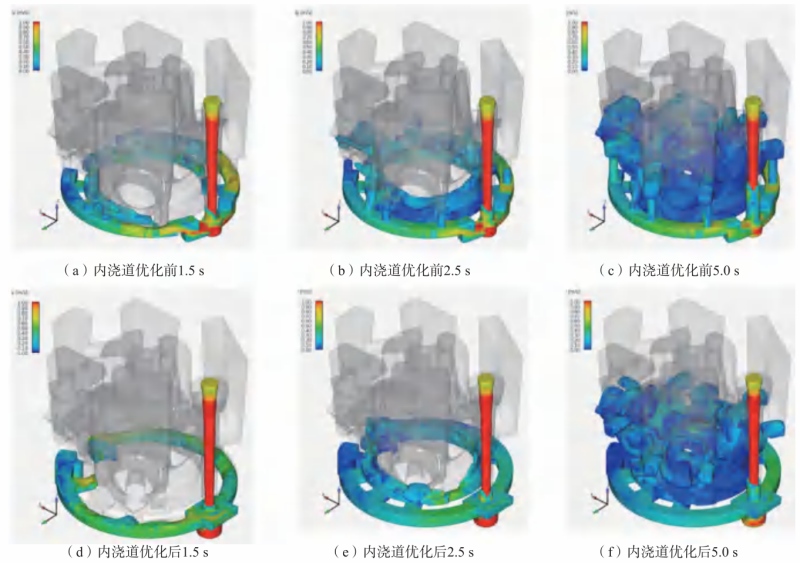 图7 浇注系统卷气分析 对比发现,内浇道形状优化后,金属液前端的卷气位置大量减少,如图7(d)和(e)所示。金属液由横浇道经内浇道引入铸型时,金属液自下而上进入底部法兰位置,随后沿壁面上升,不需经过改向,因此充型更为平稳,减少了卷气风险。在浇注中期,即5 s时,金属液前端卷气现象几乎消失,如图7(f)所示。经计算,优化后的铸造工艺方案如图6(b)所示,工艺出品率为31%。 图8为浇注开始阶段内浇道优化前后的金属液流速模拟结果。对比上下两组图片发现,在浇口窝、横浇道以及内浇道附近,优化后的浇注系统流速更小,表明通过内浇道形状的优化设计,可以降低金属液流动速度,且流动更为平稳。