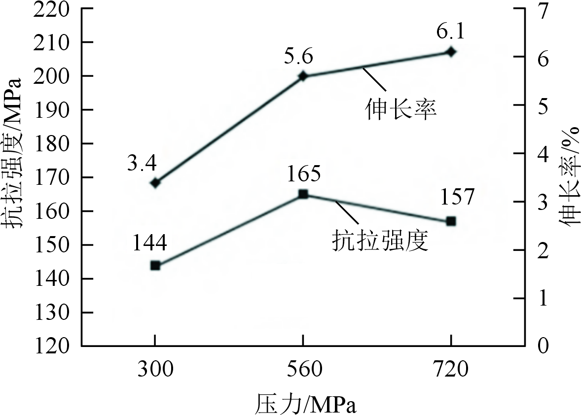 近液相线挤压铸造是经典挤压铸造技术与半固态加工技术融合发展的结果,因此,也称为半固态挤压铸造或流变挤压铸造。研究者采用低频电磁搅拌进行熔体预处理,结合近液相线挤压铸造的方法成功制备了组织细小、均匀致密且无宏观缺陷的GW103K铸锭,其屈服强度比传统挤压铸造提高了8 MPa,T6处理后提高了13 MPa,效果更加明显;140 MPa比压条件下半固态挤压铸造Al-8Si-Mg-Fe合金T6处理后的抗拉强度、屈服强度和伸长率分别达到了352.5 MPa、280.4 MPa和7.3%。半固态挤压铸造 Al-7Si-1.0Cu-0.5Mg合金的抗拉强度、屈服强度和伸长率分别达到了为379 MPa、299 MPa和7.5%。可见,近液相线温度挤压铸造和半固态挤压铸造都可以进一步细化铸态组织、显著提高合金的力学性能。将GISS技术与挤压铸造技术结合的半固态挤压铸造也有明显的细化组织和提高力学性能的作用。 2.超高压挤压铸造 在传统的挤压铸造概念中,比压存在饱和值。当比压低于这个饱和值时,随着比压增大,不仅能使材料的密度增大、微观组织细化、力学性能提高,而且还能改善工艺性能,特别是Al-Cu合金的热烈敏感性改善显著;当比压超过这个饱和值时,再继续增大比压,材料性能保持稳定甚至下降。所以,传统的铝合金挤压铸造的比压一般不超过120 MPa。 但是,随着研究工作的深入和挤压铸造材料范围的扩大,挤压铸造的比压存在饱和值的理念受到了挑战,出现了比压高达近千MPa的超高压挤压铸造。研究者针对汽车用Al-20Si合金进行的超高压挤压铸造试验,发现虽然比压对强度的影响都表现出饱和值,但强度的饱和值高达560 MPa,远高于通常认知的临界比压,见图1。在低于560 MPa条件下,随着比压升高,初生Si相的数量逐渐减少,尺寸逐渐减小,圆整度越来越高,α-Al枝晶数量越来越多,合金的抗拉强度先升高后降低,伸长率则持续升高。比压达到560 MPa时,Al-20Si合金的抗拉强度达到最大值(165 MPa),随后比压再继续增加,强度则有所下降。但材料的塑性则不存在饱和值,比压由300 MPa增加到720 MPa时,Al-20Si合金的伸长率由3.4%提高到 6.1%。采用935 MPa的比压对过共晶Al-17.5Si合金进行挤压铸造,其硬度(HBS)比金属型重力铸造显著提高,由54提高到64.5。
