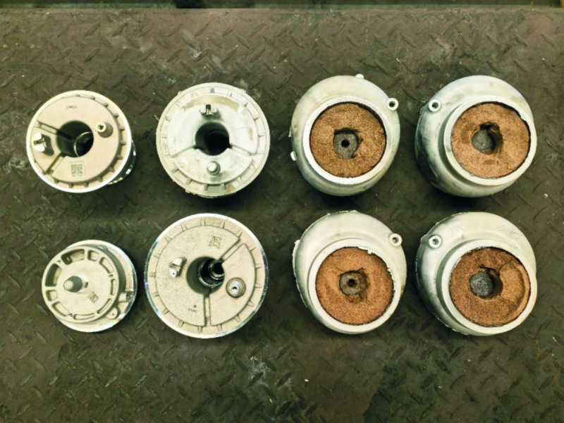 图1 超高压挤压铸造铸件的力学性能 3.带砂芯挤压铸造技术 轻量化需求推动了复杂薄壁结构件成形的快速发展。压铸技术是薄壁复杂结构件成形的优先选择,但由于中空结构件高压铸造面临的砂芯材料的强度和溃散性的矛盾难以解决,目前尚无成熟应用。采用3D打印砂芯,强度足够高,但溃散性较差,发气量大,仍不适合批量化生产。挤压铸造的液流速度比压铸低得多,近年来带砂芯的挤压铸造引起了关注。 砂芯总体上分为可溶性盐芯和可溃散砂芯两大类。郑洪伟研究了用于高压铸造的可溶性盐芯,其抗弯强度达到了21 MPa。有研究者开展了铜合金氧枪喷头和钢质活塞件等具有复杂内腔制件的挤压铸造试验,证明可以使用可溶芯挤压铸造复杂内腔零件,但其溶出时间较长,生产效率有待提高。开展了挤压铸造A356.2铝合金专用砂型和专用涂料的研究,开发出了挤压铸造专用砂芯HDSC01和与之配套的专用涂料HDCoat03,成功解决了挤压铸造条件下砂芯强度和溃散性之间的矛盾。生产应用表明,在挤压铸造比压小于83 MPa和分段阶梯加压的条件下,可以进行铝合金复杂内腔结构件的挤压铸造,砂芯不会被压溃,所得铸件无粘砂、夹砂和气孔缺陷,组织细密,可以热处理强化。图2为采用带砂芯挤压铸造技术生产的汽车空悬系统结构件。