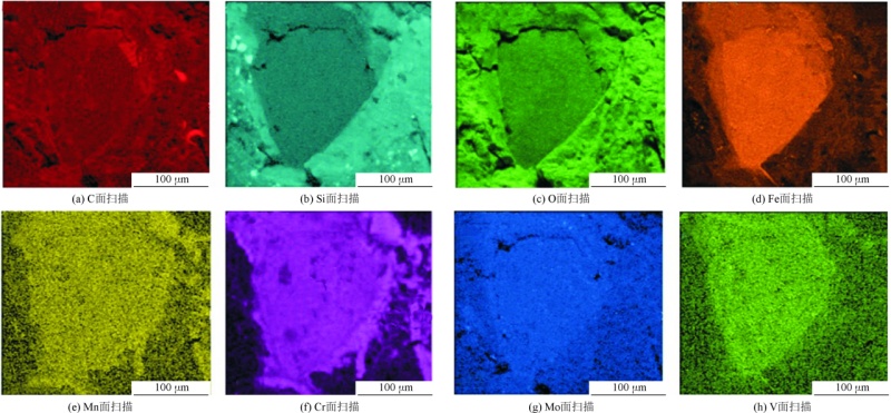 图4 模具浇口纵截面金相图片 表2 模具脱碳层的化学成分(%)