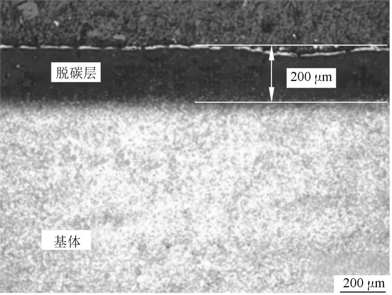 图3 模具浇口裂纹断面的EDS分析 模具长时间在高温环境中工作时,表面会失去部分或全部C,造成表层组织C含量降低,成为脱碳层。脱碳使表层组织固溶C含量下降,从而弱化材料的力学性能。图4为模具浇口纵截面的金相照片。可以看出,经过腐蚀后,脱碳层与基体呈现不同的颜色衬度,在经过约10 000模次服役的模具表面发现脱碳层,脱碳层厚度约为200 μm。利用能谱仪对脱碳层和基体进行化学成分分析,见表2。可以看出,表层脱碳层的C含量远高于基体的量,而其他合金元素基本一致。脱碳会造成表层组织C含量降低,导致硬度降低,进一步使模具的热疲劳性能下降。